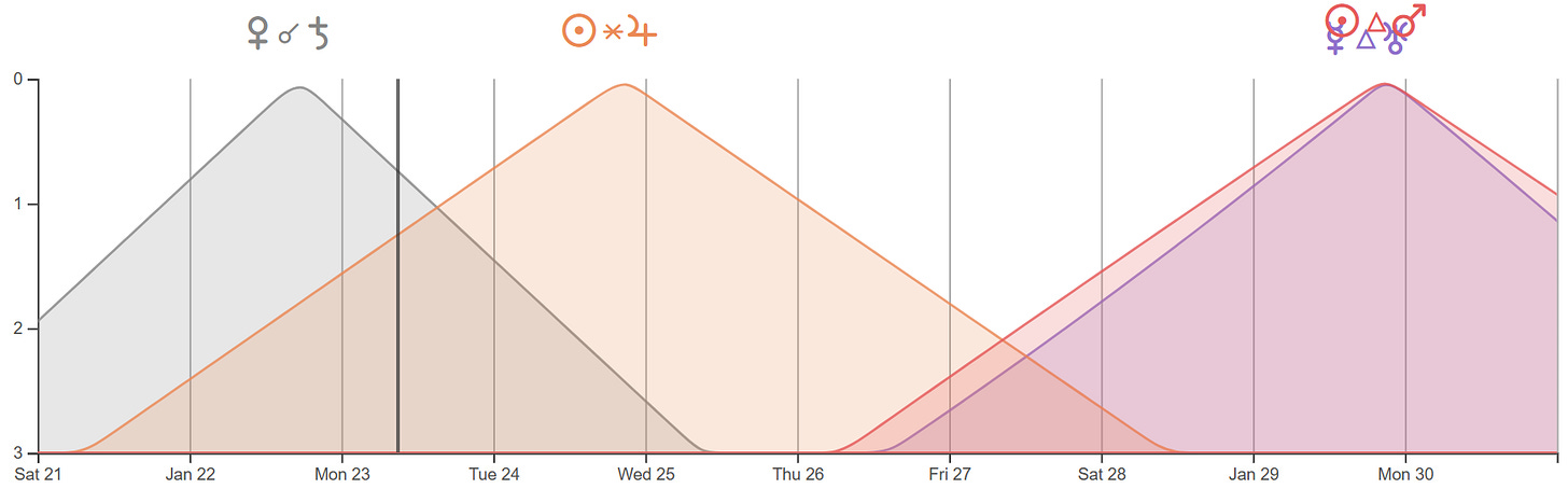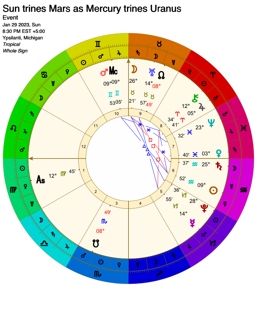 This upcoming Sunday, the Sun in Aquarius will make a very intellectual air trine with Mars in Gemini. This will be going on simultaneously with Mercury’s trine to Uranus, which will happen this Sunday for the third and final time of its current retrograde cycle.1 Think back to the periods around December 17 and January 8, which were the two previous days this Mercury-Uranus trine went exact. I know that this trine has brought me a lot of game-changing insights about my health. Mercury-Uranus is all about looking at things in a new way and the flashes of insight that suddenly flip things around. With the Sun-Mars air trine in the mix, we could find ourselves working with ideas or thinking through things, perhaps connecting with others over the sharing of ideas (Mars is in the gregarious sign of Gemini and at the time of this trine will be beyond 8° Gemini, which is where it stationed direct a couple weeks back).